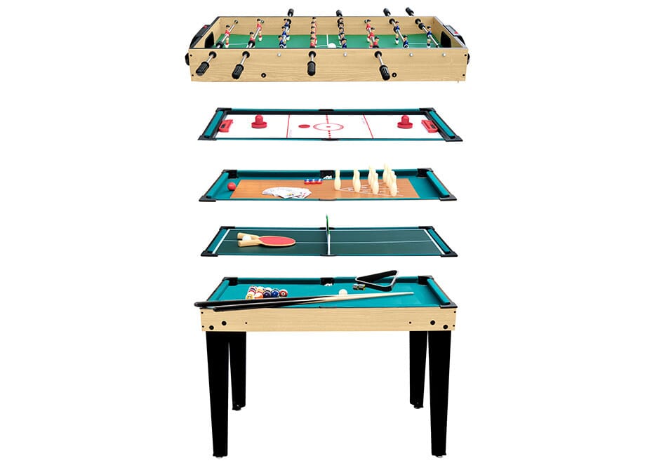 Un babyfoot multi jeux est la table idéale pour les enfants et toute la famille puisque même mes adultes pourront trouver le plateau qui les intéresse le plus. La partie baby foot enfant propose un terrain vert en bois assorti de de barres en acier chromé (télescopiques ou non selon le produit) avec des joueurs en plastique souvent de couleur bleu et rouge avec short blanc et noir. Les poignées noires permettent de contrôler les balles lancées sur le terrain. Le plateau de air hochey permet de faire glisser des palets grâce aux poussoirs fournis avec tous les autres accessoires. Si la table de air hockey a un souffleur d'air, alors le palet glissera encore plus vite. Le billard (souvent la partie attachée aux pieds) fourni les accessoires suivants: queue, boules, triangle et craie pour des parties précises. La table de ping pong possède un filet qui s'attache sur les bords du plateau et vous pourrez jouer avec les raquettes et balles fournies. Puis vous trouverez en fonction des multijeux proposés un plateau pour chaque autre jeu (échec, jeu de dames, etc...). Le montage est assez simple même s'il existe plusieurs plateaux et pièces détachées et une notice est fournie pour vous aider dans votre démarche.