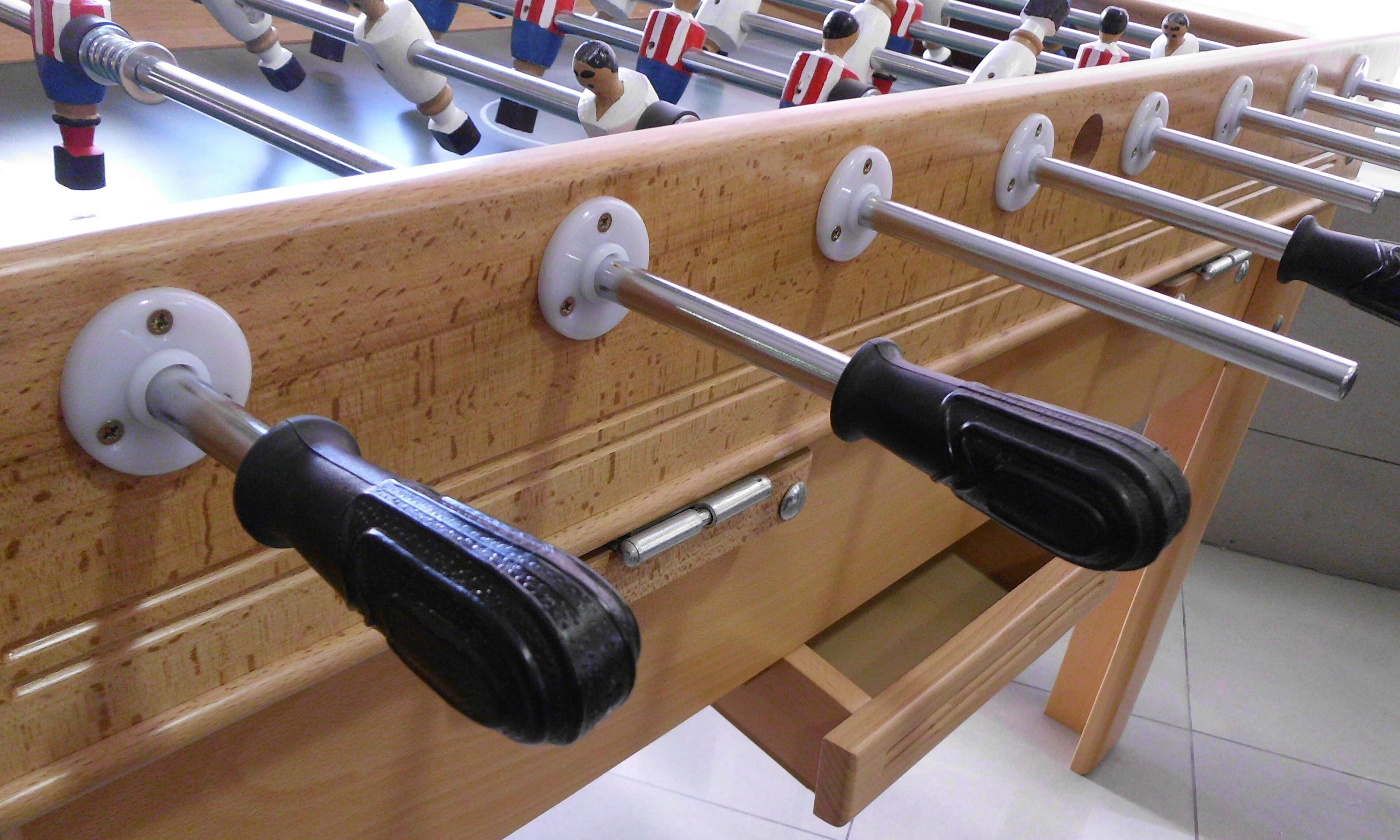 Les barres traversantes sont en acier chromé avec un diamètre de 15 mm. Elles sont équipées de ressorts afin de restituer les mêmes sensations que le jeu de café auquel vous êtes habitué. Les poignées ont été designées pour une meilleure accroche de la main qui améliore votre contrôle. Enfin les joueurs avec les maillots de l’Atletico Madrid et du Real vous permettront de rejouer les plus grandes confrontations espagnoles ! Ces joueurs sont en bois de haute densité, incassables et peints à la main !