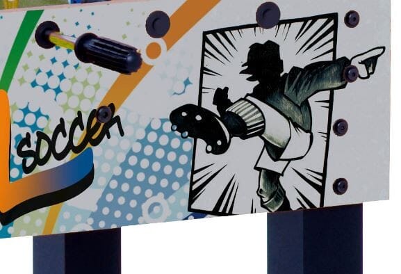 En terme de design, le F-1 n’a rien à envier à ces aînés tel que le G-100 ou même le G-500. On retrouve cette forme très rectangulaire avec des lignes droites qui est la signature même de la marque italienne. Le baby foot est disponible en couleur noyer bois foncé mais également avec un design spécial enfant intitulé Graffiti GOAL qui reprend des couleurs franches pour donner un peu de vie dans la salle de jeu ou la chambre de vos enfants !