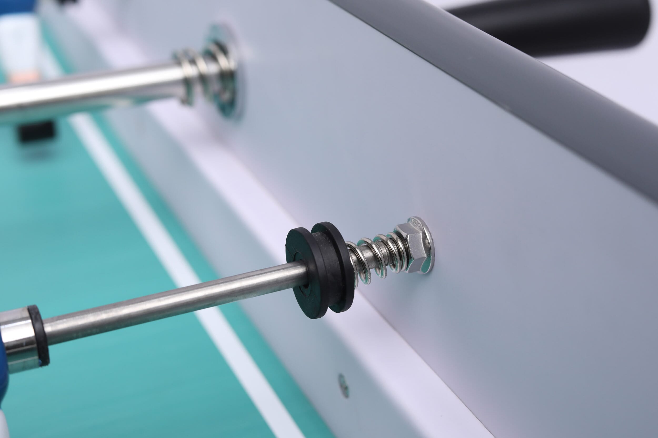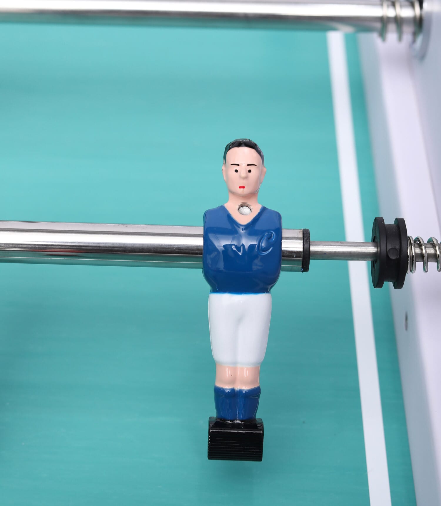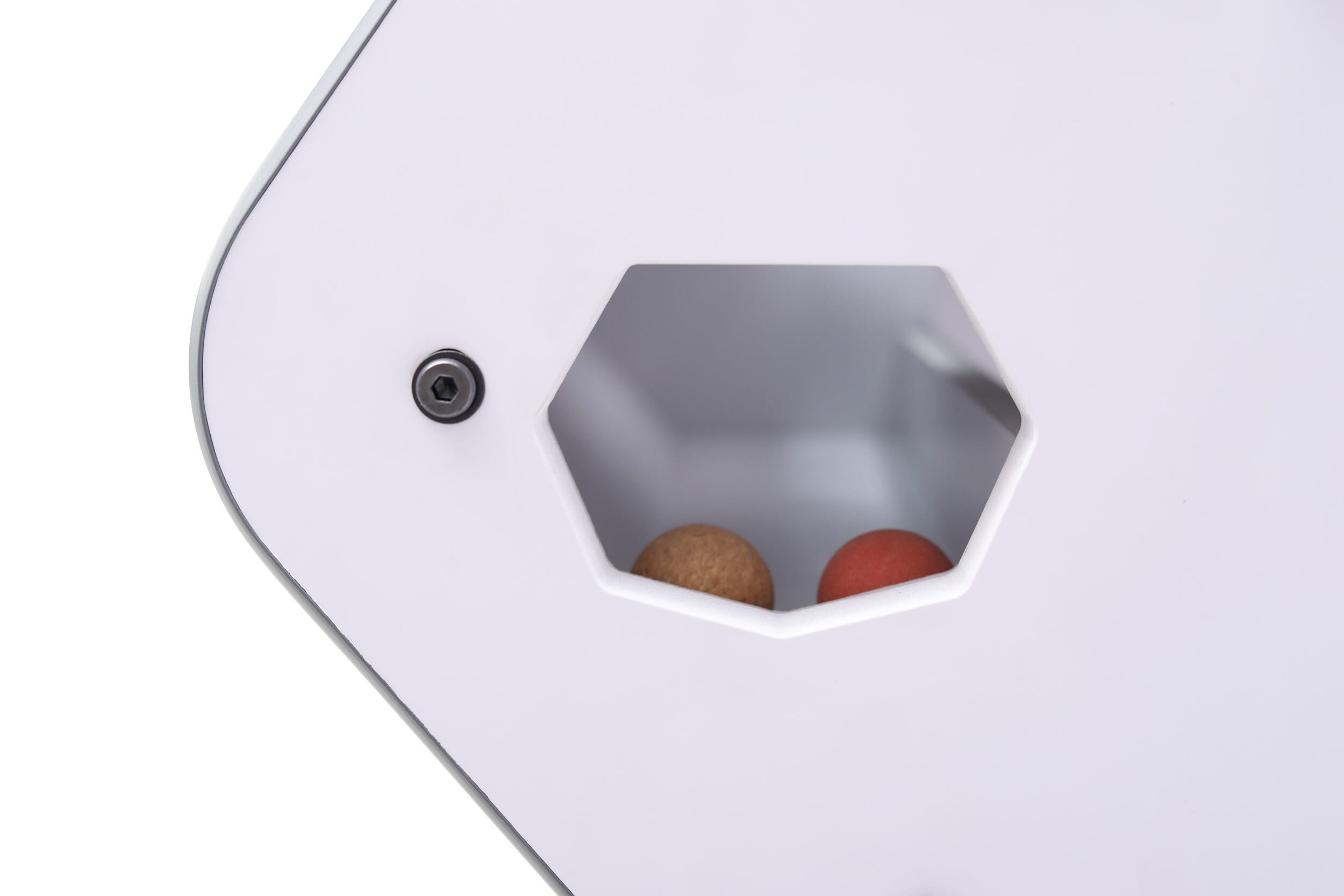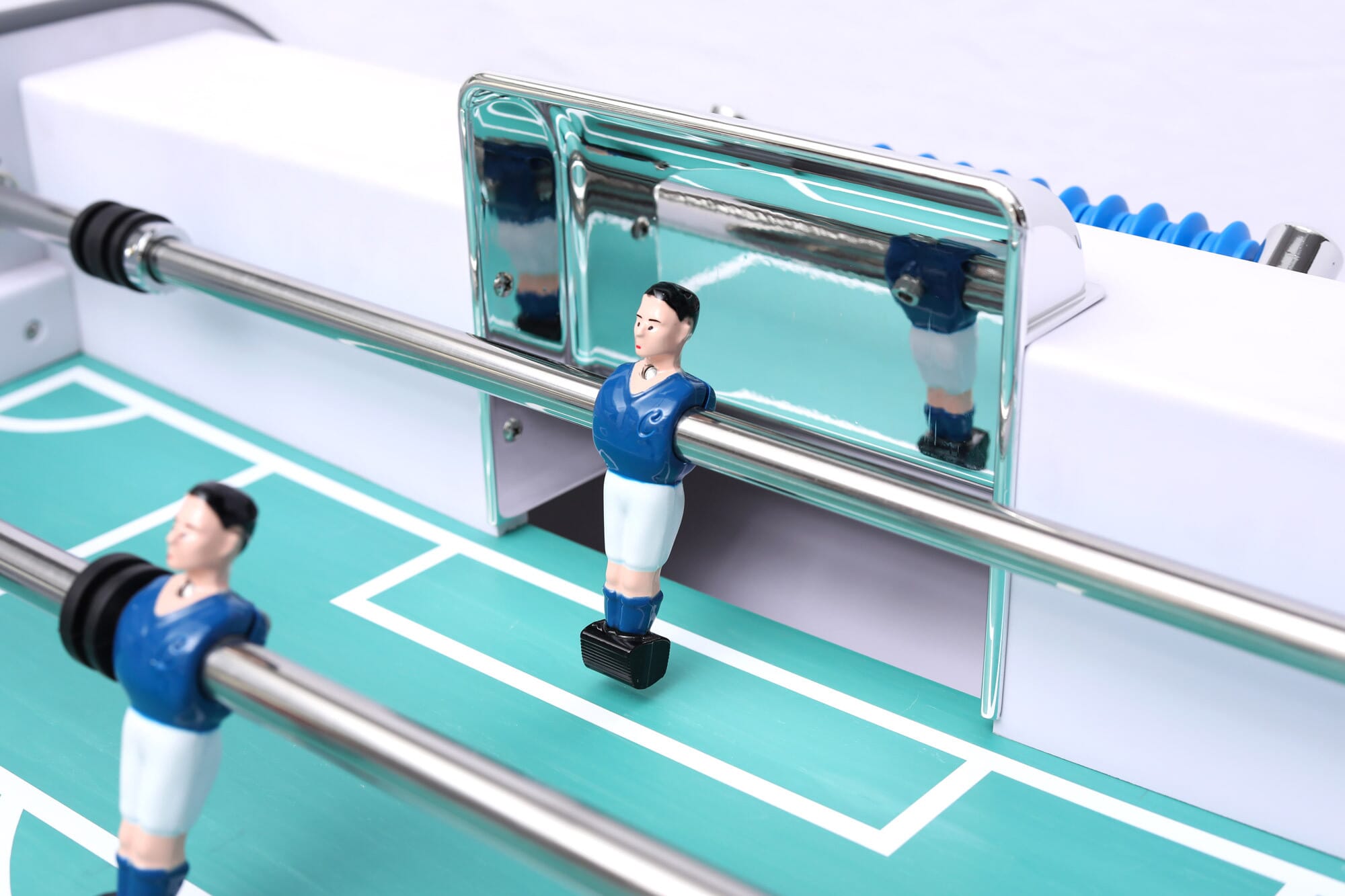 Après plusieurs années de recherche de matériaux, de design, à créer des prototypes, à les tester au fil des saisons pour voir sa résistance aux intempéries, Catenaccio a enfin trouvé la table qui manquait. Il aura fallu pas moins de 4 prototypes pour être sûr d'utiliser le WPC, une nouvelle matière éco-responsable composé de bois et de matières plastiques recyclées. Plus résistant aux chocs que du bois et non-poreux, son efficacité pour des meubles de salle de bain en fait le parfait matériaux pour un babyfoot d'extérieur. Pour les barres, rien de plus efficace que de l'inox qui offre une excellente résistance à la corrosion et peu d'entretien. Enfin, les pieds sont en acier ce qui en plus de rendre la table extrêmement stable et sont recouvert d'une peinture anti-rouille. Le design a été choisi pour proposer une table design mais gardant les codes du babyfoot traditionnel (terrain en Gerflex vert, joueurs bleu et rouge). Catenaccio a fait le choix de couleurs modernes avec des pieds dont la teinte est un mix de beige et de gris pour s'allier au terrain vert et au reste de la caisse blanche. Le choix d'une visserie noire assorti au logo centré au milieu de la caisse en contraste de la caisse blanche donnent au Acqua outdoor une allure sportive qui reprend les codes de la marque