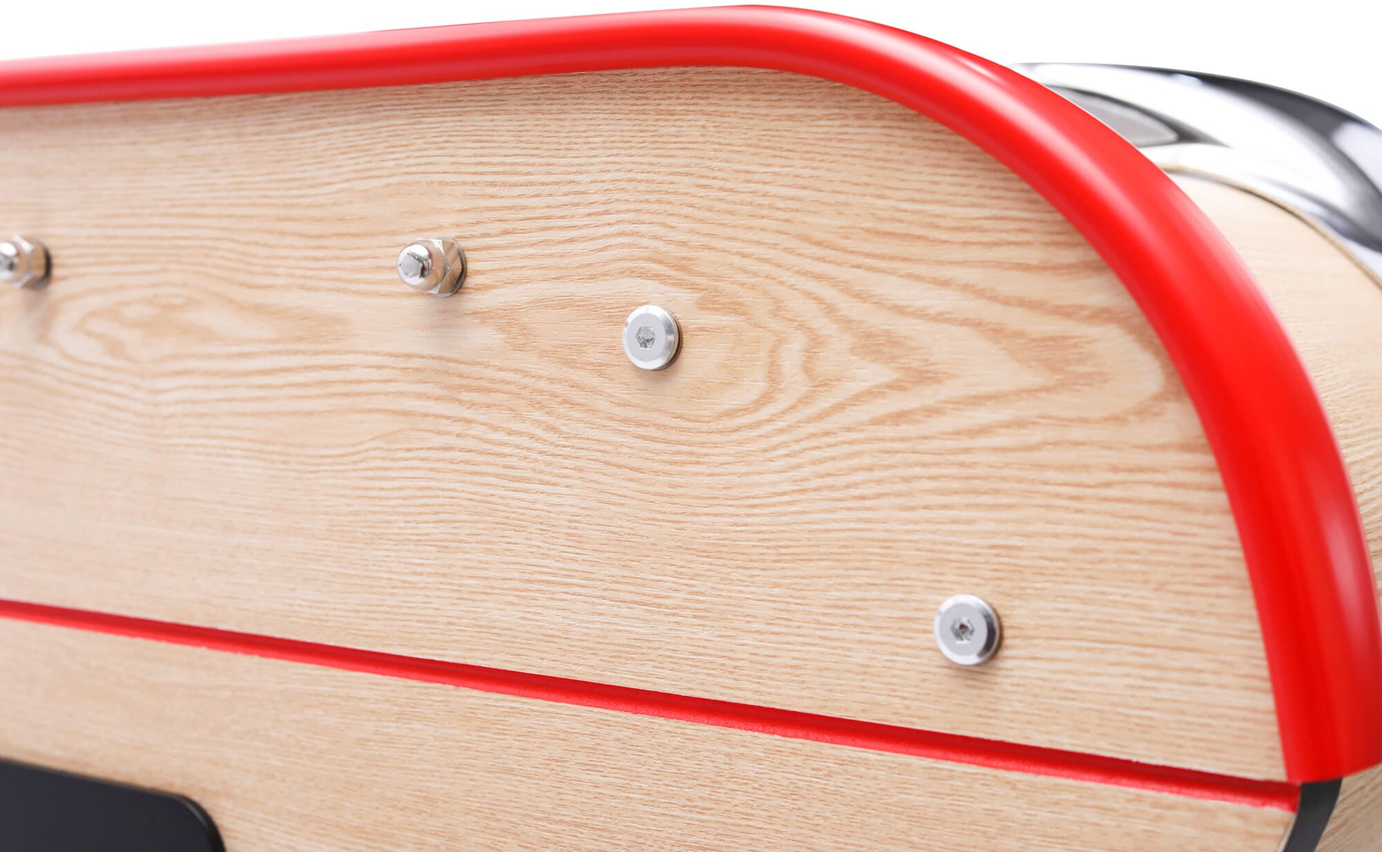 Outre des matériaux de premier ordre pour résister des années et des sensations de jeu authentiques, la marque a travaillé les lignes avec style. Le premier élément qui saute aux yeux et la forme des cages qui fait penser à une entrée d'aire / une bouche d'aération comme on trouve sur des voitures de course ou des avions. Cela donne une impression de vitesse et un style sportif à cette table. Le logo est visible par découpe dans le métal des cages. Un détail appréciable. On retrouve une main courante rouge, des joueurs en fonte d'aluminium et un tapis en Gerflex traditionnels. Mais en dehors de ces aspects, on a aussi une arrivée centrale pour récupérer les balles comme dans un bar, au milieu ! Les balles sont retenues par une barre métallique. Le tapis est tracé avec le logo de la marque au centre. Un travail dans le bois est présent avec des lignes rouges qui soulignent le logo central noir brillant. Les compte point ont été placés à coté des cages pour permettre de suivre le score.