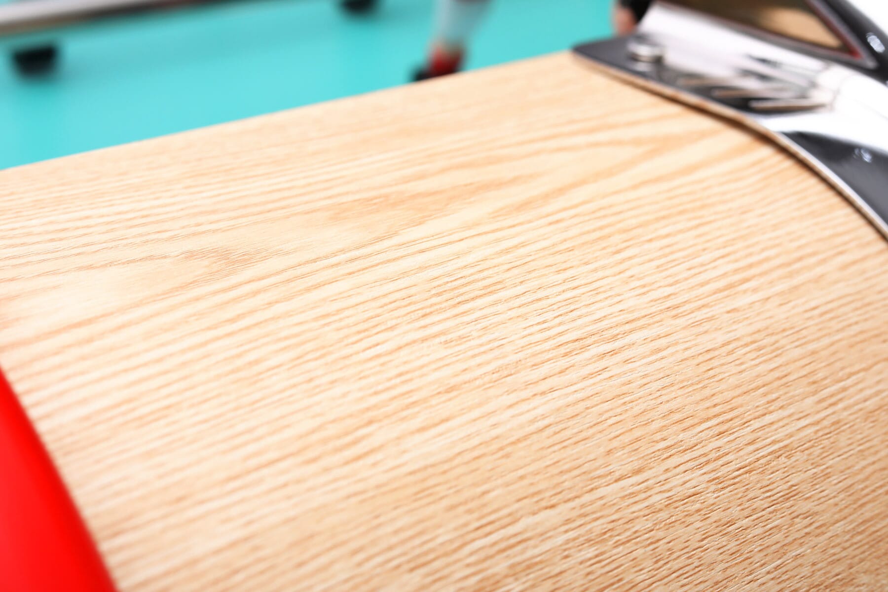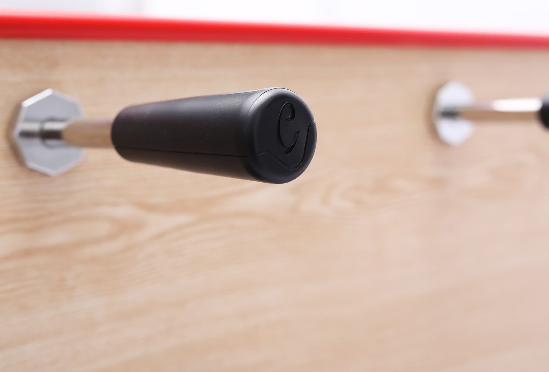 Pour cette table, la marque française a monté d'un cran l'ensemble des matériaux utilisés et cela se voit et se ressent dès la prise en main ! La première chose qui saute aux yeux et aux bras est le poids et la matière des pieds : au lieu de pieds en bois traditionnels, ici, ils ont en acier recouvert d'une peinture époxy noire. Outre la finition sans faute et la beauté de la matière, les pieds sont épais et lourds, ce qui promet une stabilité incroyable. On retrouve habituellement des pieds en métal uniquement sur les tables de compétition pour éviter que la table ne bouge lors de parties "sportives". Et sur le babyfoot de compétition Catenaccio Prima, vous pourrez vous y donner à fond, la table ne bougera pas avec un poids de plus de 90kg. La caisse est elle en bois MDF de qualité supérieure avec un mélaminé de qualité industrielle résistant à l'humidité mais également au feu ! Rien que ça ! Ce revêtement est anti rayure et pour l'avoir testé en frottant nos clefs dessus, on ne voit aucune trace. Les barres pour plus de résistance sont en Inox et d'une fluidité remarquable. Equipées de bagues en nylon, les barres coulissent sans effort pour retrouver les mêmes sensations que sur un babyfoot de bar. Un babyfoot qui résistera des années sans aucun doute !