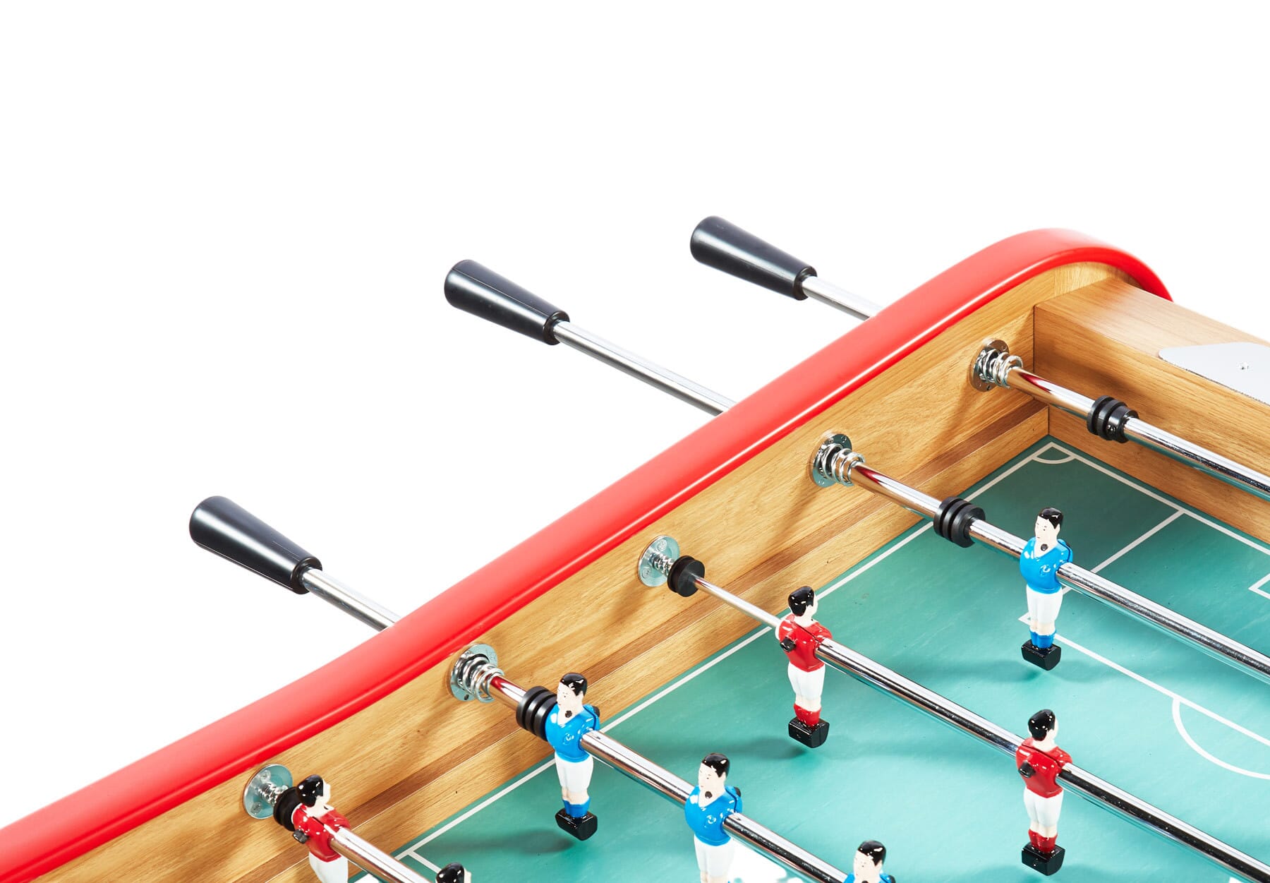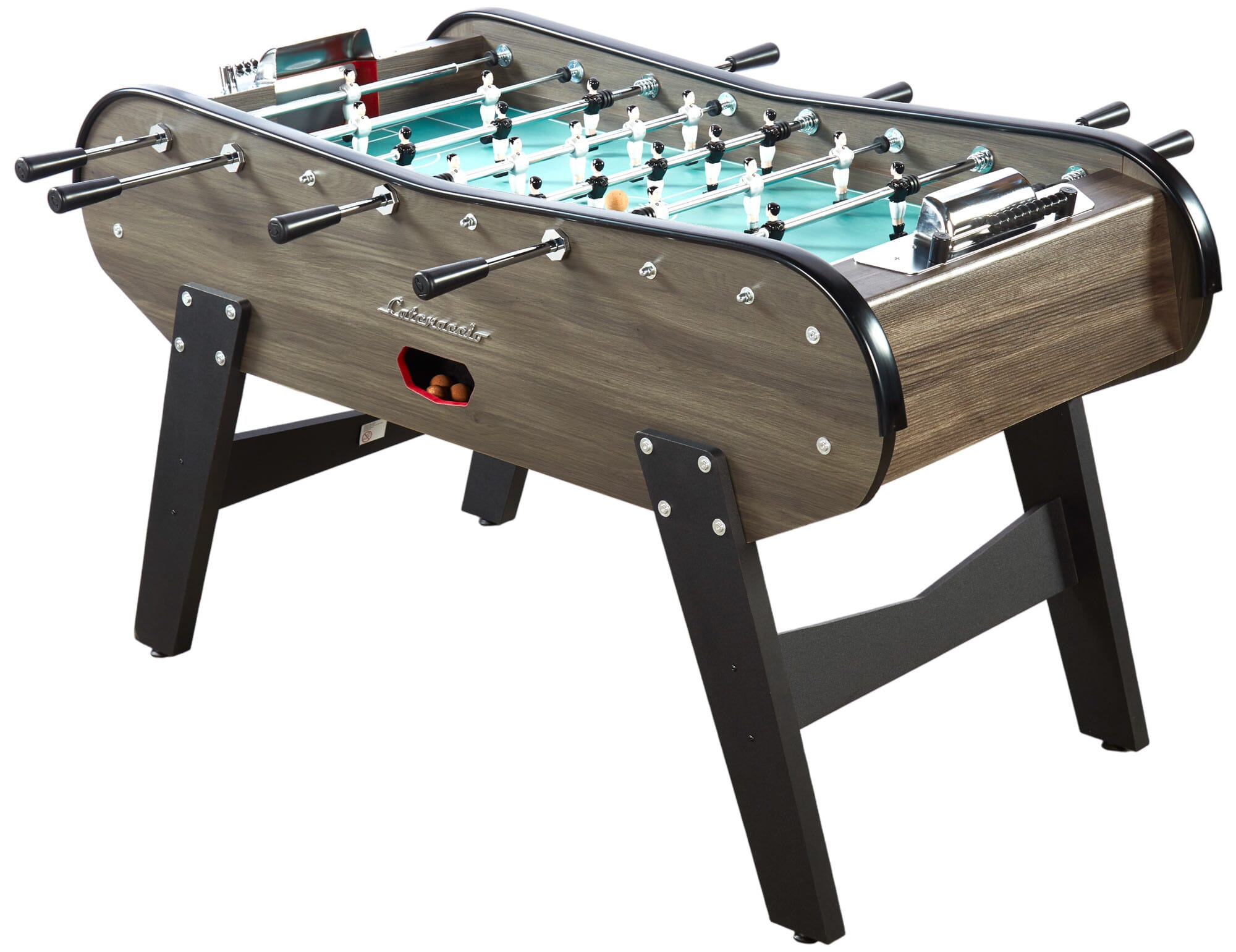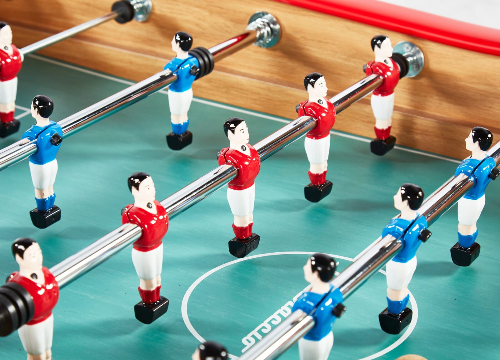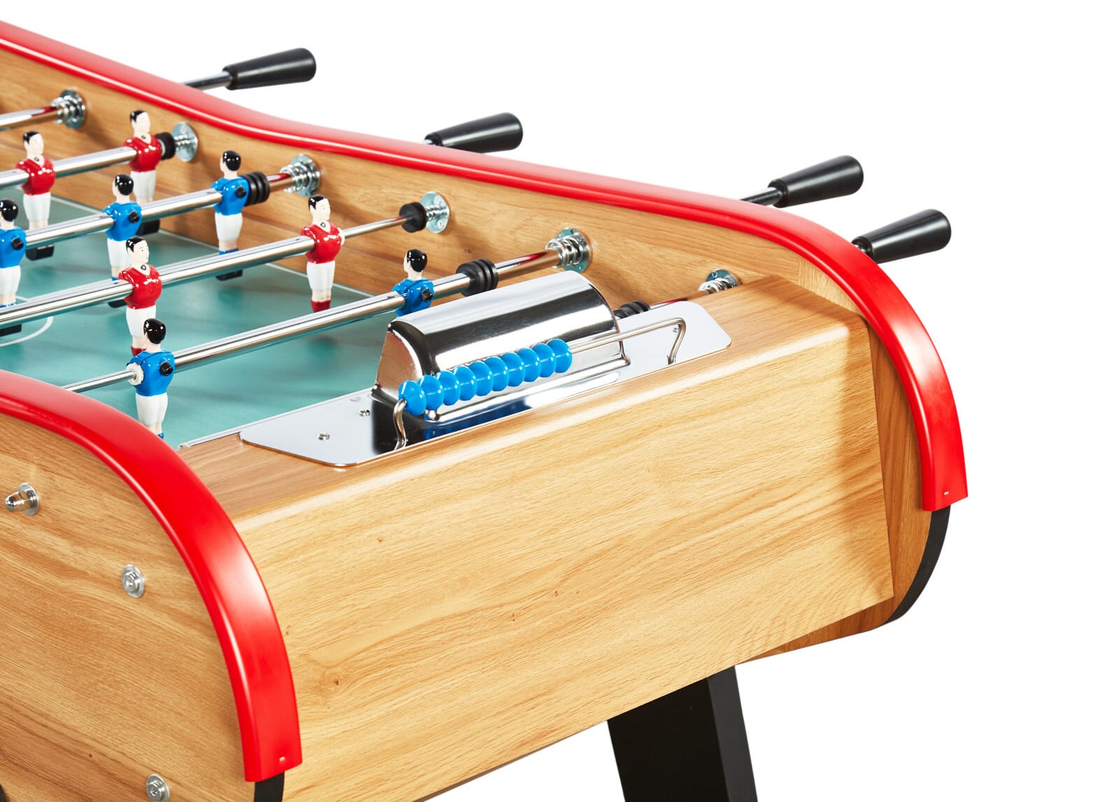 La descente de balle est restée centrale comme sur les modèles avec monnayeur pour garder le même plaisir d’avoir les balles toutes rangées au même endroit ! Les barres de 15,8 mm de diamètre sont plus épaisses que la quasi-totalité des barres sur le marché et sont en acier chromé avec amortisseurs en caoutchouc doublés de ressorts en métal pour un jeu fluide. En plus de ses caractéristiques de table pro, son poids a aussi été travaillé pour le rendre assez lourd pour que des adultes puissent jouer dessus. Les coins du terrain sont évidemment relevés et le fond des cages est en métal pour qu’on puisse entendre le fameux bruit des tables de café à chaque but marqué !
