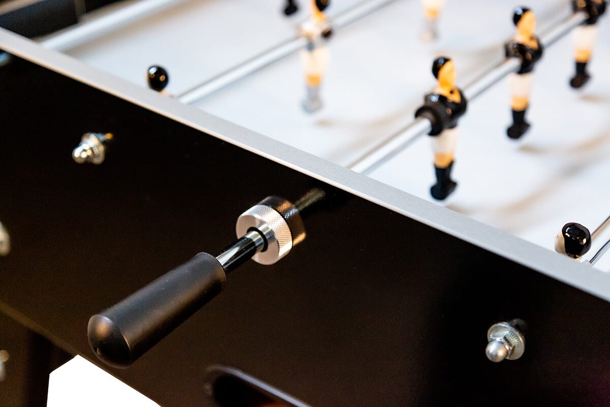 En effet, pour ce modèle de qualité, la fabrication 100% française de cette table a mis les petits plats dans les grands avec une jouabilité exceptionnelle. Les barres en acier chromé inoxydable d’un diamètre de 16mm supportent des joueurs en aluminium vissés à l’aide d’une vis serrage gorge. Ces joueurs sont entièrement peints à la main en gris et noir au lieu des traditionnels équipes rouges et bleues. Ainsi l’aspect design et contemporain de ce baby foot se voit renforcer par ce genre de détail qui fait la différence. De même, le tapis de jeu est en gerflex gris clair créant une parfaite harmonie avec le reste du baby foot. Pour les anxieux qui penseraient ne pas voir la balle, pas de soucis, les balles ne se fondent pas dans le paysage et vous pourrez retrouver toutes les sensations du baby à la française. Ainsi gamelles, repêches et autres demi-compte-double animeront vos parties endiablés sur cette table familiale.