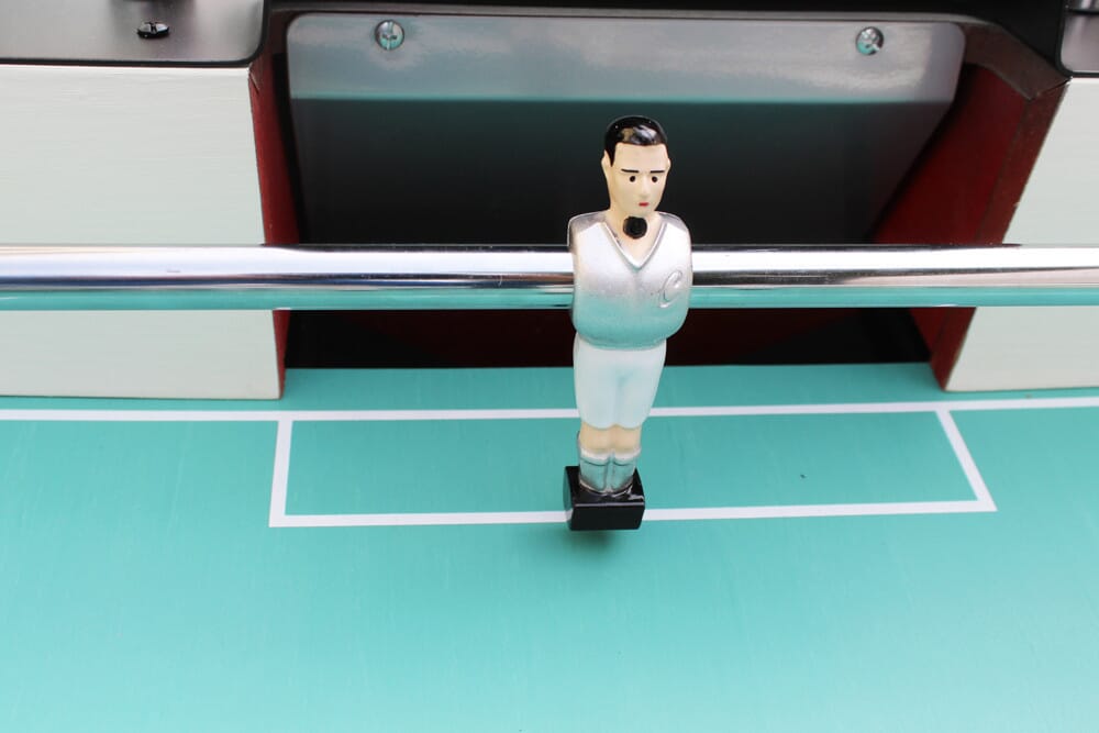 Un tapis en Gerflex vert, des joueurs accordés à la table de couleur noir et gris peints à la main, et un dessus et un fond de cage métallique qui fait résonner le son franc du but marqué.