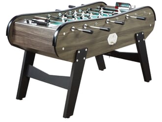Derrière son allure moderne, le modèle de bar en bois gris taupe conserve tous les éléments emblématiques du baby-foot de café. On y retrouve un terrain vert classique, des joueurs bicolores peints à la main, ainsi qu’un fond de cage métallique qui restitue le son caractéristique du but marqué.