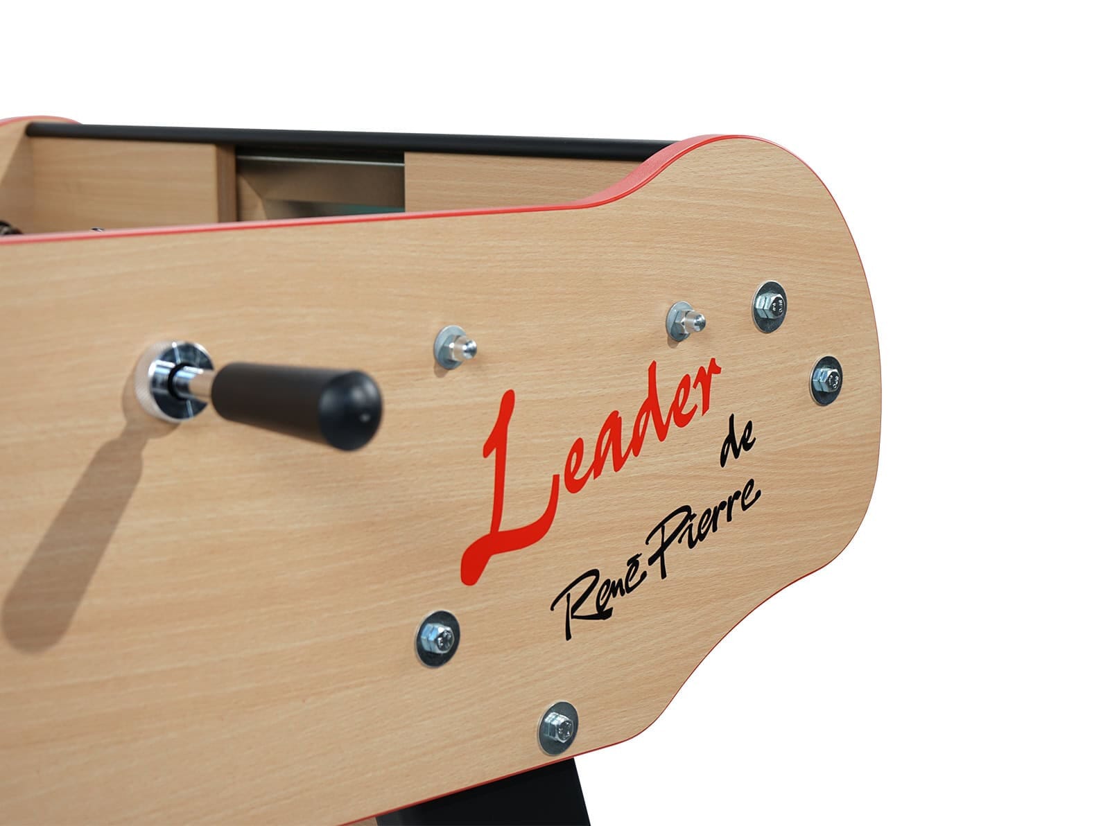 La caisse du Leader de René Pierre est en bois MDF avec des panneaux couleur hêtre et ses pieds sont en bois peints de couleur noir. Cette structure lui confère une grande stabilité avec poids de 73kg parfaitement réparti. Le contour de la caisse et la main courante est de couleur rouge comme on peut trouver sur les tables Bonzini, Stella et autres fabricants français. Les pieds sont noirs et renforcés par un panneau en bois pour éviter les vibrations lors de parties sportives et des frappes lourdes! Le terrain est en Gerflex de couleur verte et les joueurs sont en fonte d’aluminium vissés sur les barres avec maillots rouges ou bleus et short de couleur blanche. Ils sont traversés par une vis qui part du dos et traverse la gorge comme tout baby foot vintage de troquet. Les barres sont en acier chromé et sont surmontées de poignées longues ou rondes (au choix). De part et d’autre du terrain, le fonds des cages est équipé d’une plaque en Inox afin de pouvoir entendre ce bruit si familier de la balle qui fait BONG lors d’une gamelle ou de tir puissant ! Les cages sont surmontées d’un compte point de chaque coté pour ne pas perdre le fil du match.