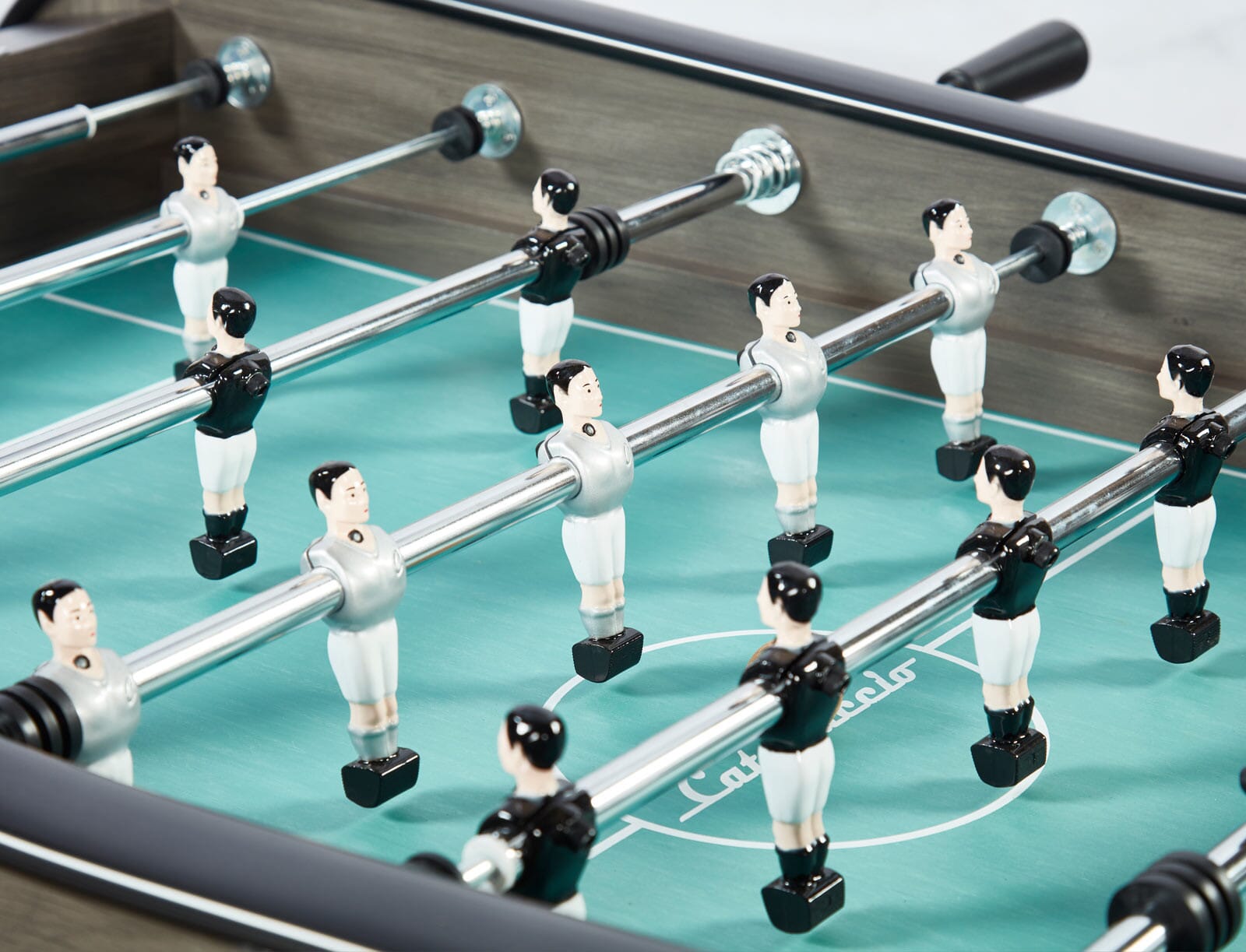 Le baby foot design gris taupe Sportivo est une table rare et unique. C’est LA couleur qui manquait à votre intérieur, pour lui apporter une touche de modernité. Sa particularité est en effet d’être un objet de décoration en plus de pouvoir ravir tous vos invités autour de parties animées. Tous les détails not fait l’objet d’une analyse et on retrouve ainsi, une plaque en métal brossé indiquant la marque, des joueurs couleur argent et blanc/noirs dont on peut distinguer le « C » de la marque sur le torse, les poignées ont été retravaillées et reprennent aussi le « C » de la marque à leur extrémité. Le terrain est tracé avec de fines lignes et ce de série sur tous les modèles.