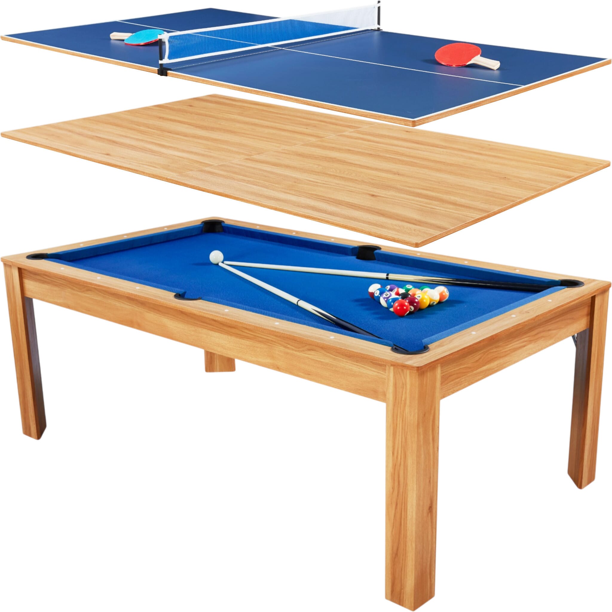 La table de billard convertible 7 FT Catenaccio Prego bois clair tapis bleu est une solution idéale pour profiter d’un véritable billard chez soi tout en conservant un meuble élégant et multifonction.