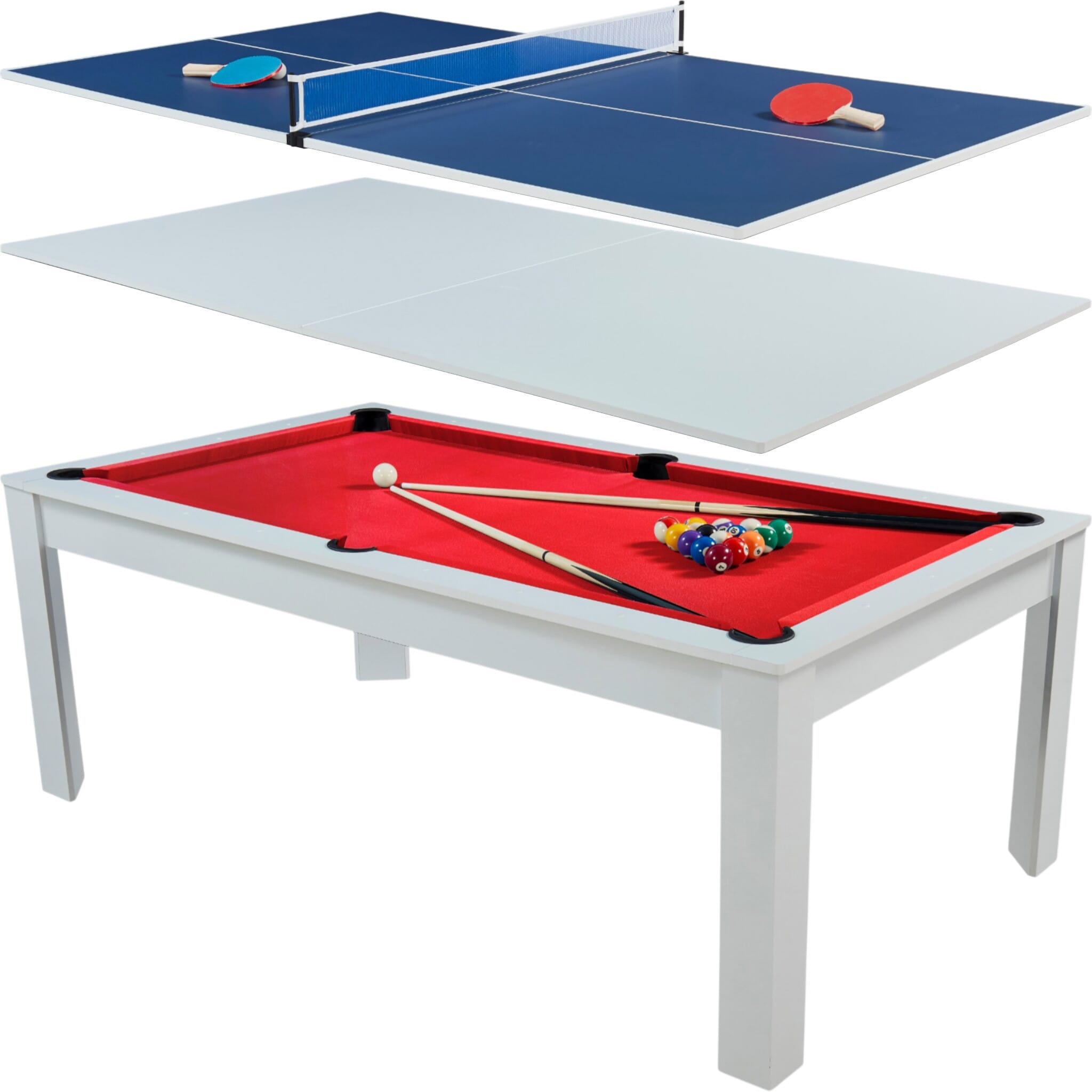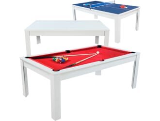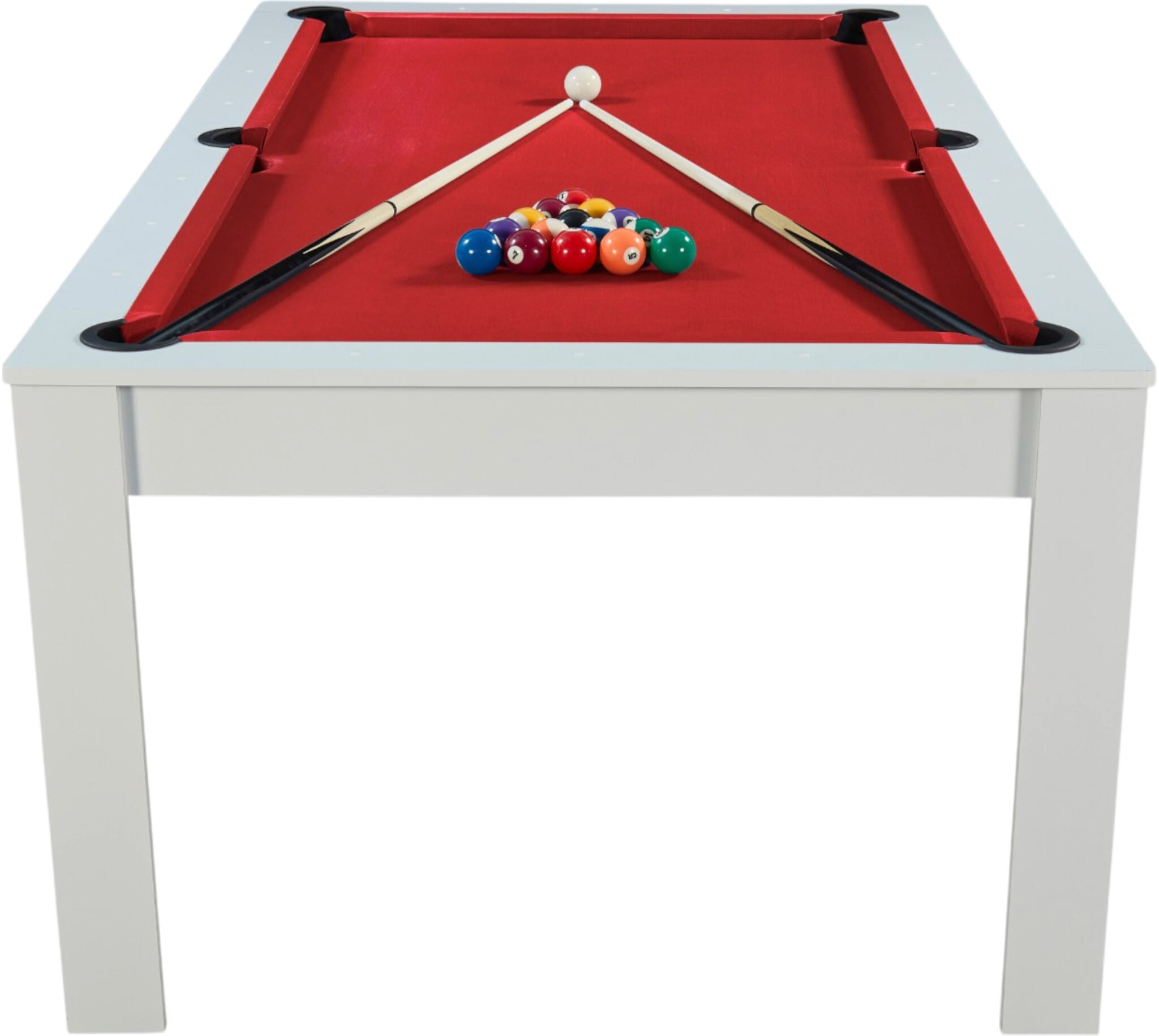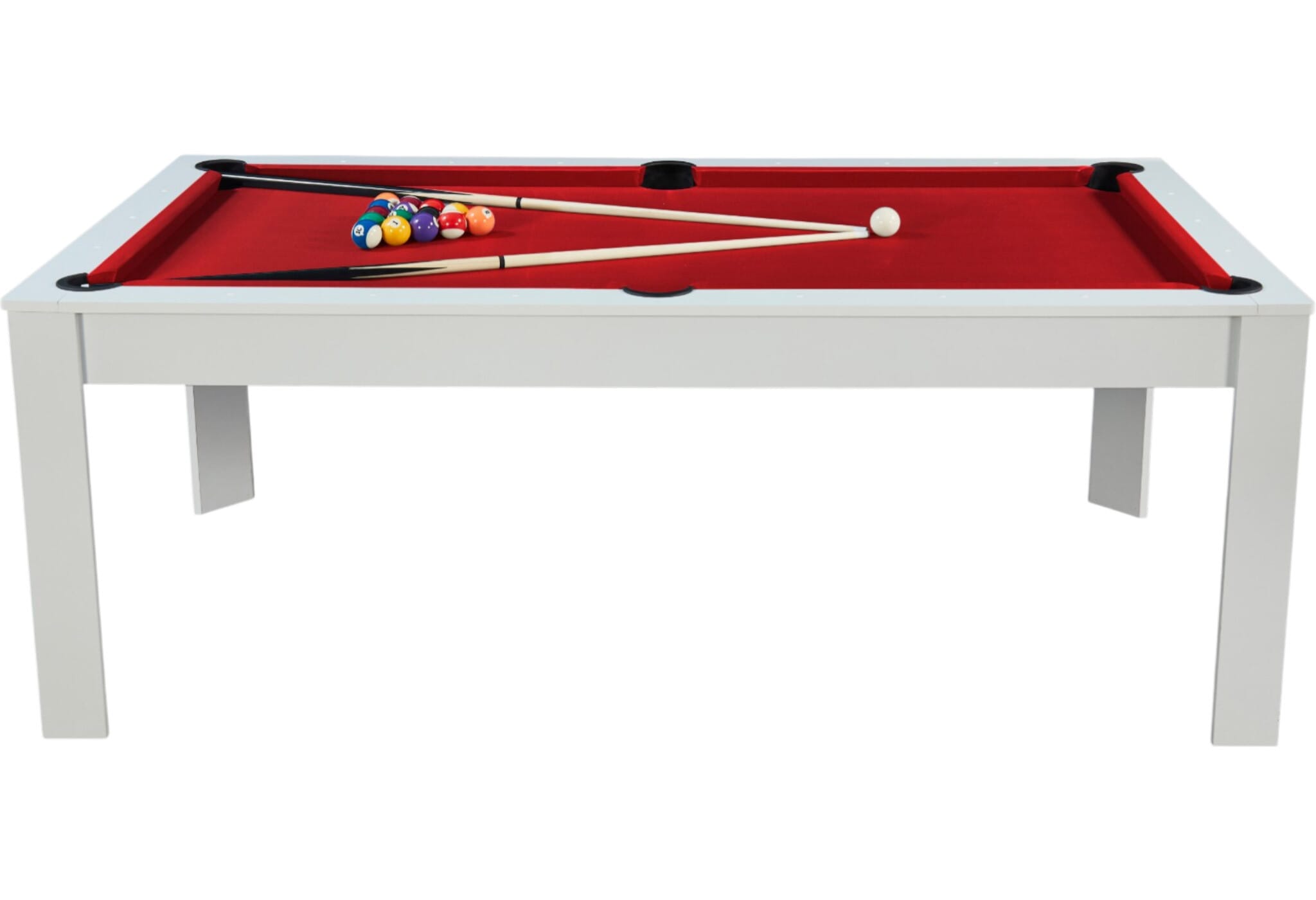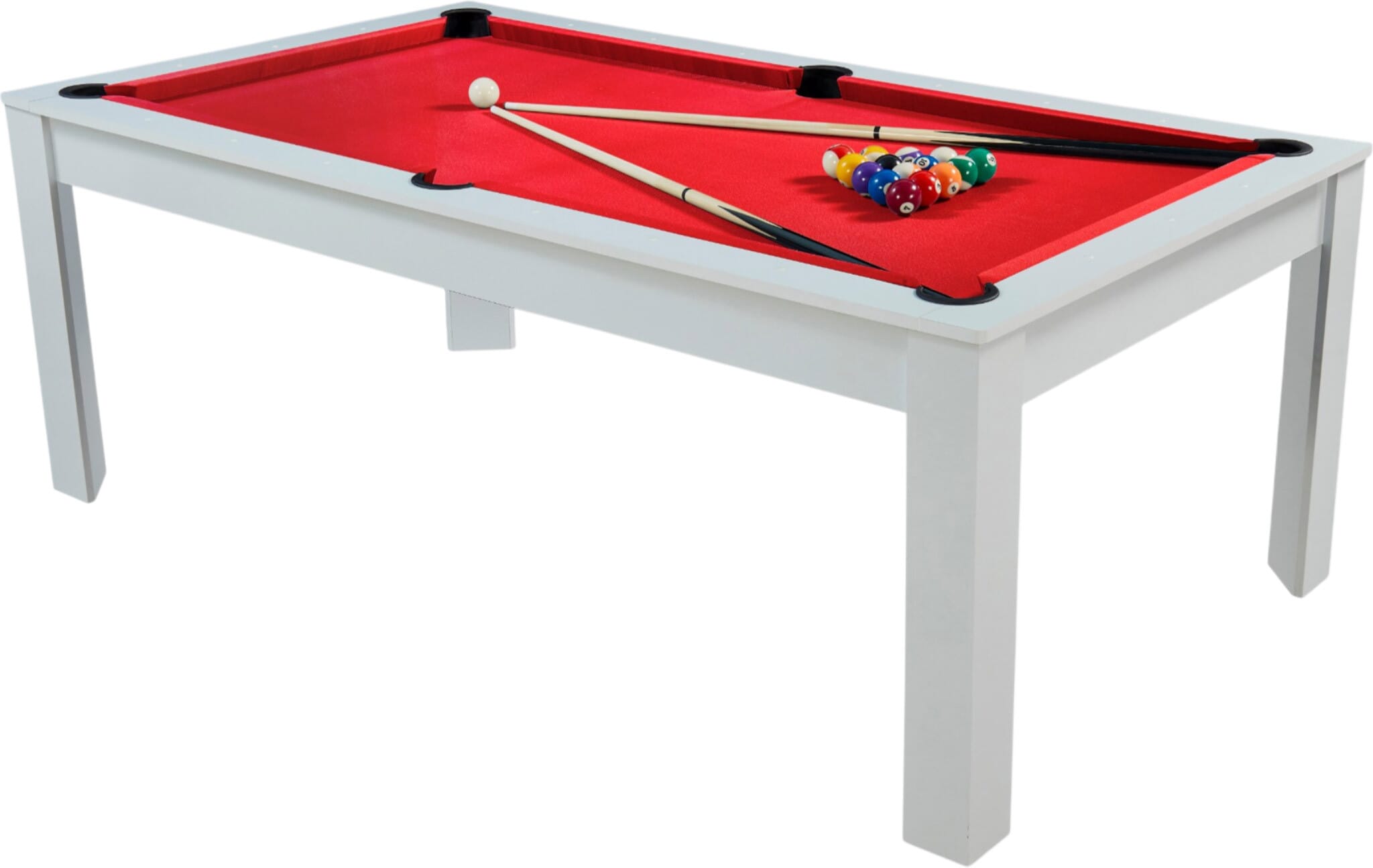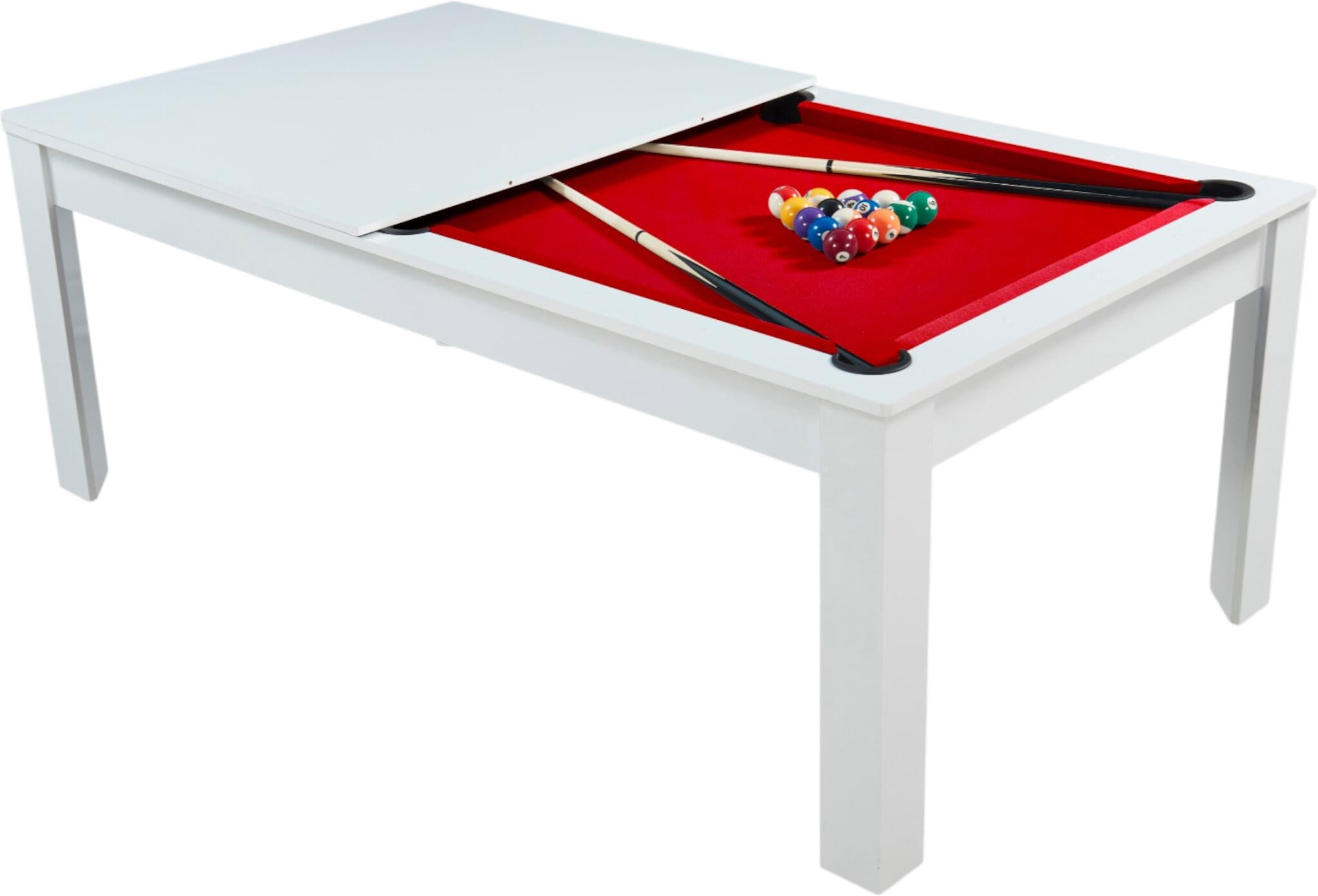Avec la table billard convertible 7 FT Prego blanc et tapis rouge, on n’est plus simplement face à un billard. On parle d’un véritable centre de vie. Un moment, vous jouez une partie de billard américain entre amis… quelques minutes plus tard, la table devient une grande table à manger conviviale.