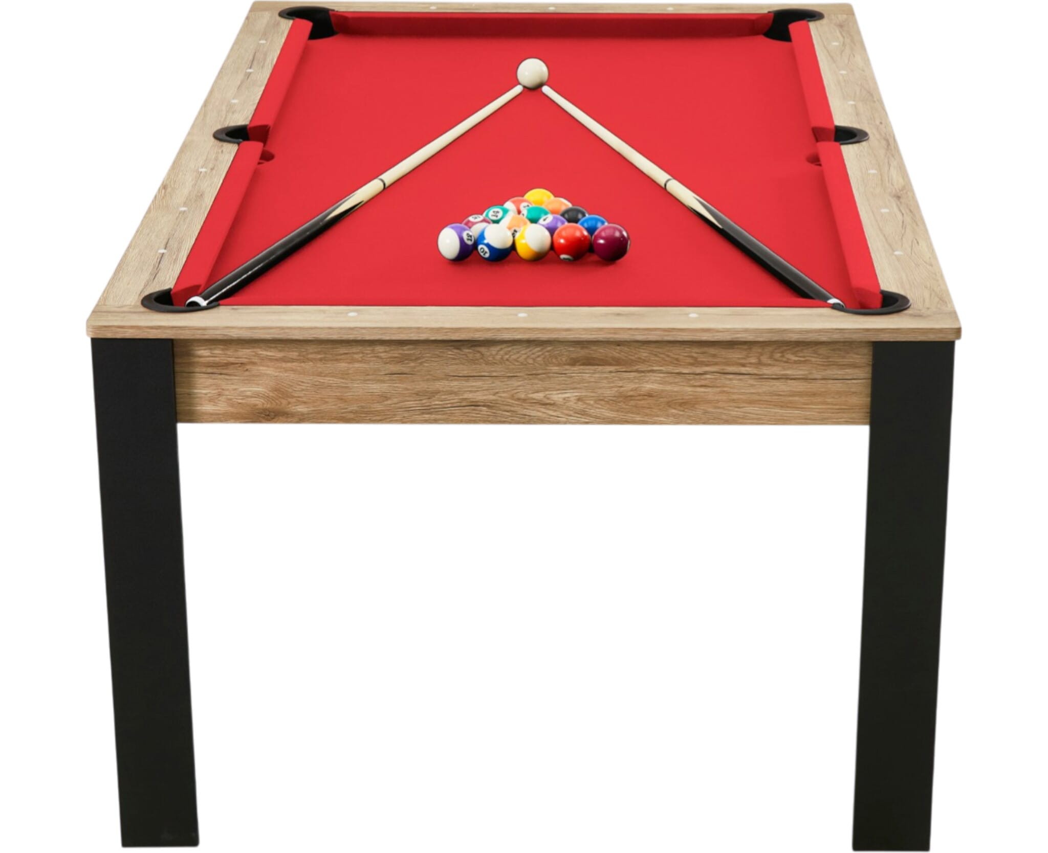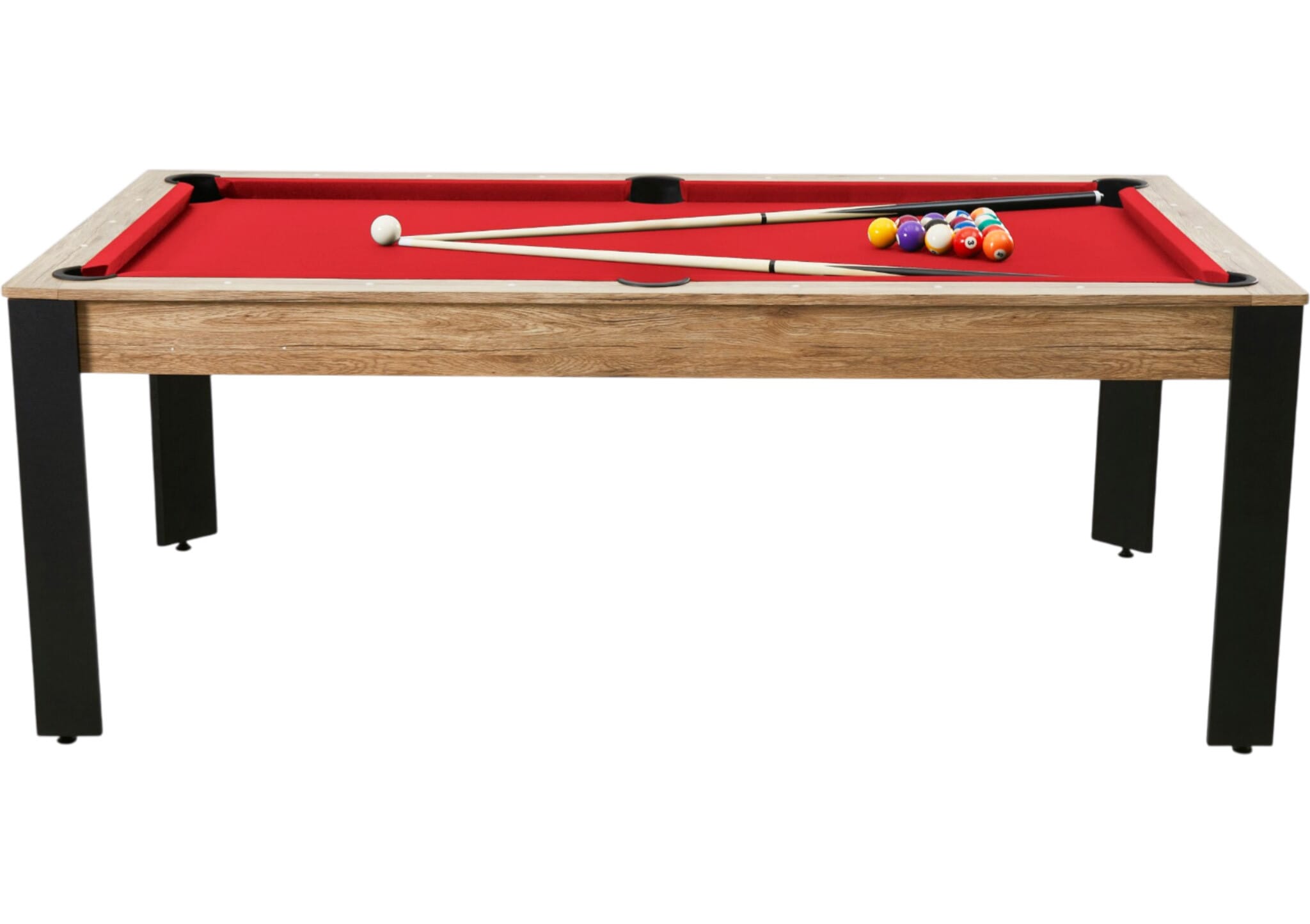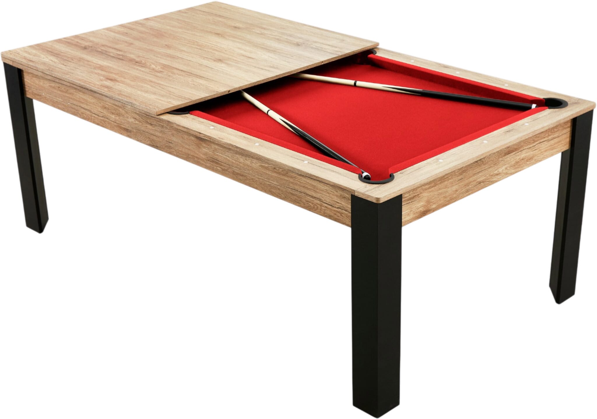 La table billard convertible 7 FT Prego industriel avec tapis rouge, c’est exactement ça : un meuble malin, convivial et terriblement ludique. On dîne, on discute, on refait le monde… puis on enlève les plateaux et la partie commence.