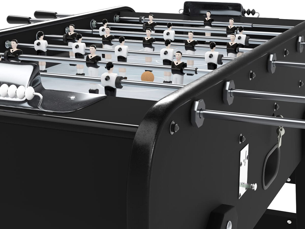 Redécouvrez les plaisirs d’un baby-foot avec monnayeur type bar avec le baby-foot Bistrot Noir, un modèle à la fois authentique et résistant. Conçu avec une caisse en panneaux mélaminés noirs, il est équipé de joueurs en aluminium montés sur des barres en acier chromé, garantissant une solidité et une jouabilité optimales. Les connaisseurs apprécieront la qualité de son tapis de jeu type Gerflex, un matériau spécialement développé pour offrir des performances exceptionnelles.