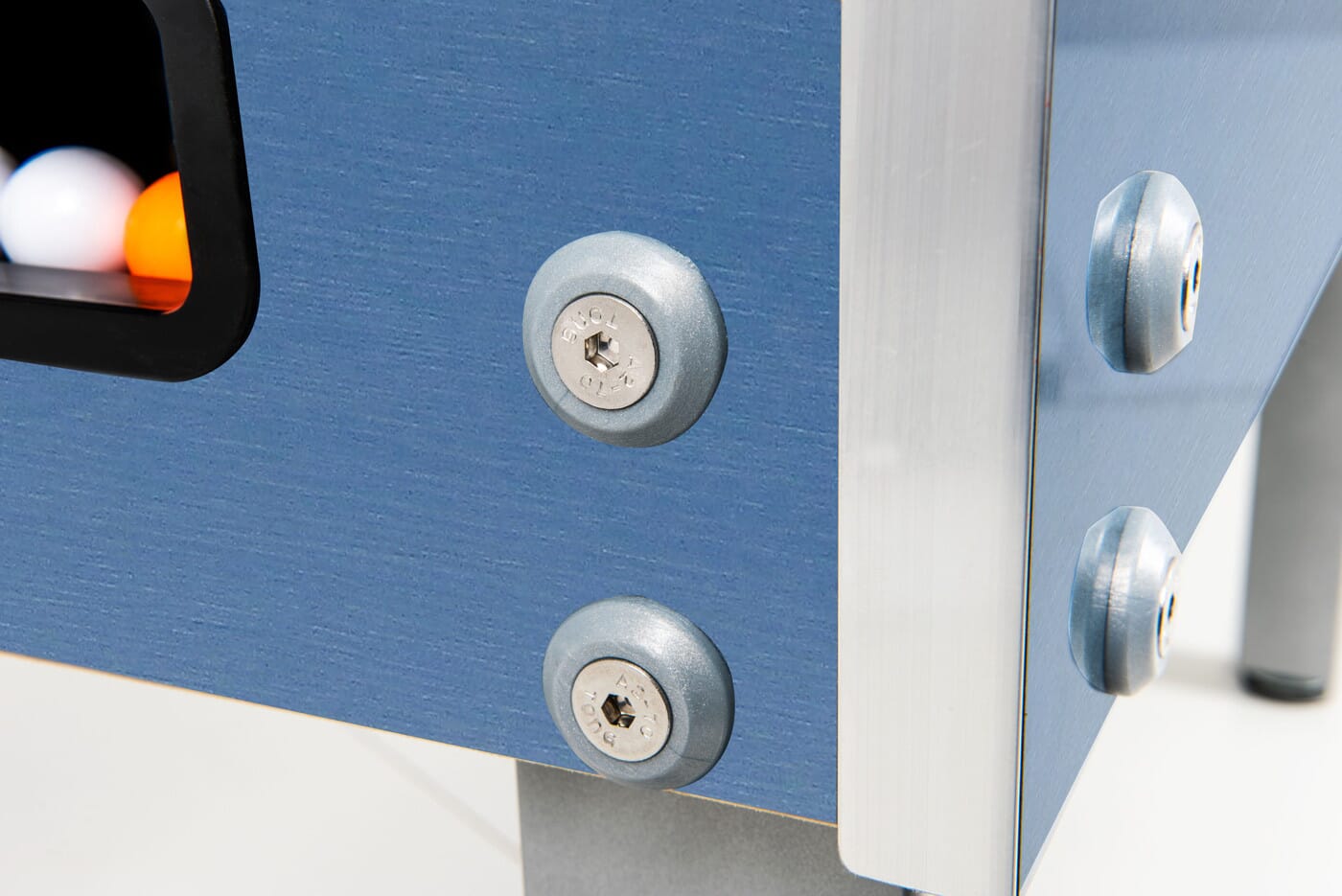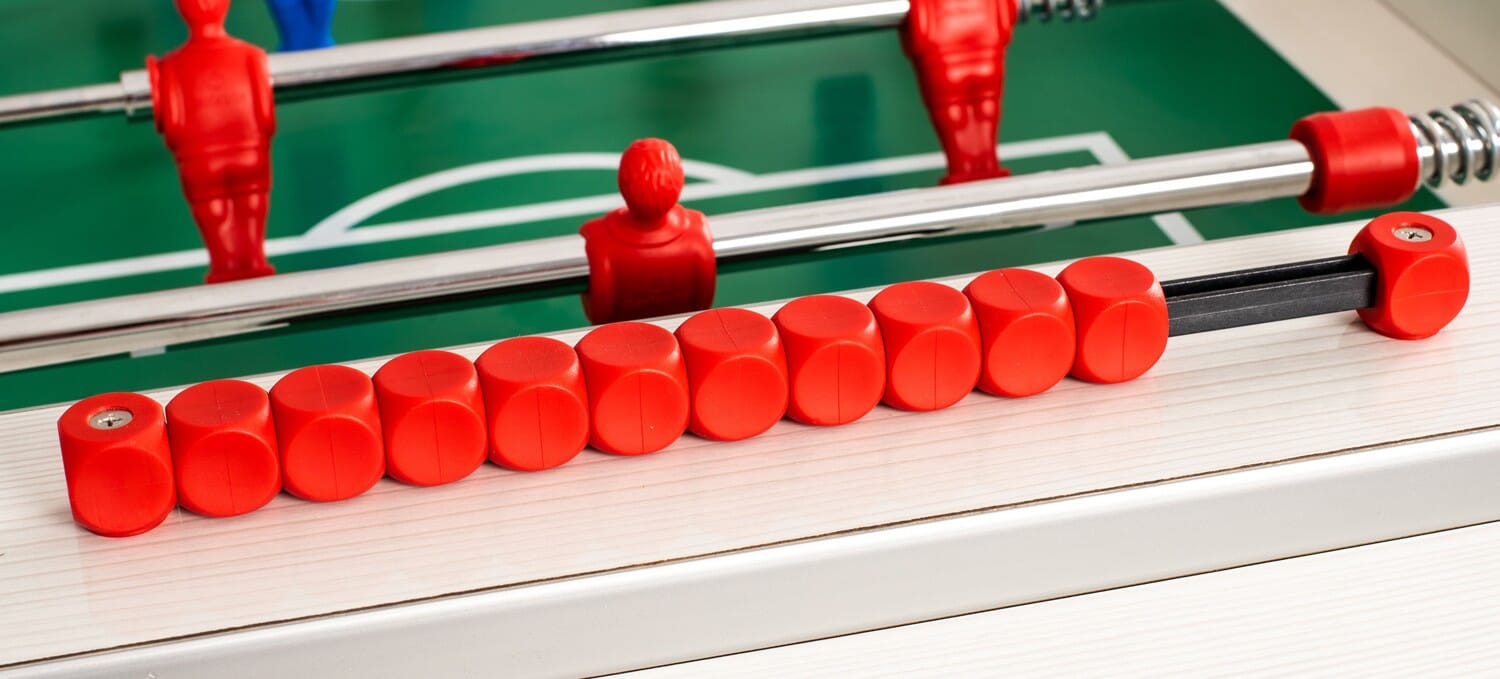 Fabriqué avec une caisse en bois stratifié de 30 mm, recouverte d’un mélaminé imperméable, ce babyfoot est prêt pour l’extérieur. Le terrain en mélaminé gris, collé avec une colle hydrofuge, empêche toute infiltration d’eau, même par temps humide. Les coins relevés assurent un jeu fluide, sans blocage.