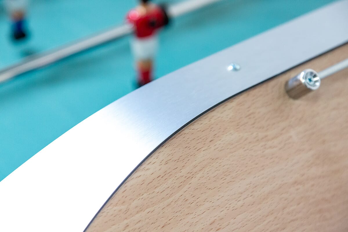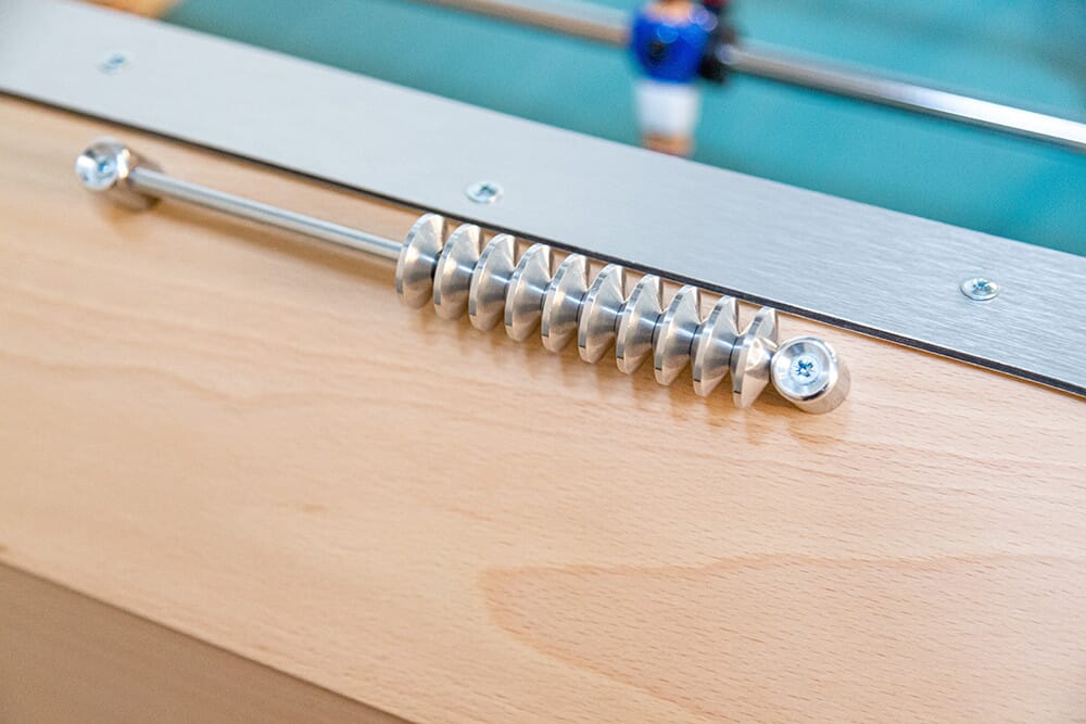 La visserie utilisée est d’exception. Ainsi les barres extérieures sont en acier chromé, montés sur des paliers en téflon avec des barres intérieures en acier soufré ce qui permet de rendre le mouvement des barres parfaitement fluide et sans accroc. Les joueurs sont en aluminium, entièrement peints et décorés à la main et montés d’une vis serrage gorge offrant un contrôle parfait de la balle ainsi qu’une puissance et une précision maximale au moment des tirs. Les poignées sont des modèles de compétition, en ABS, pour une prise en main optimale et un confort de jeu augmenté.