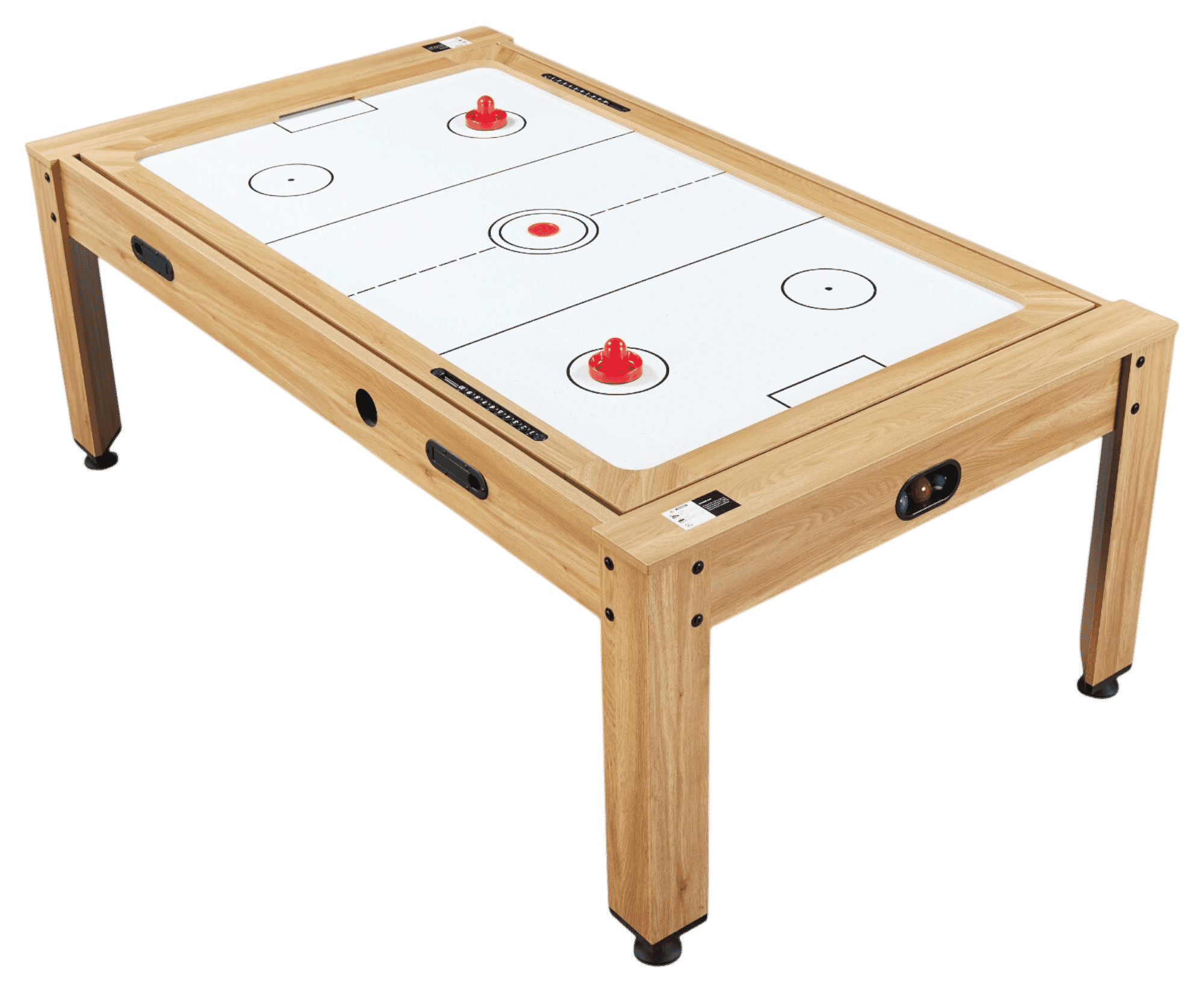La fonction air hockey repose sur une soufflerie 220 V qui propulse l’air uniformément sous le plateau. Résultat : le palet glisse sans effort, rendant les parties dynamiques et immersives. Le câble d’1,30 m facilite l’installation, et les accessoires fournis (2 poussoirs et 1 palet) permettent de lancer les matchs immédiatement.