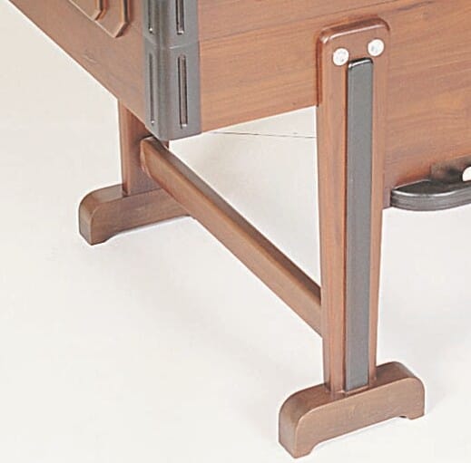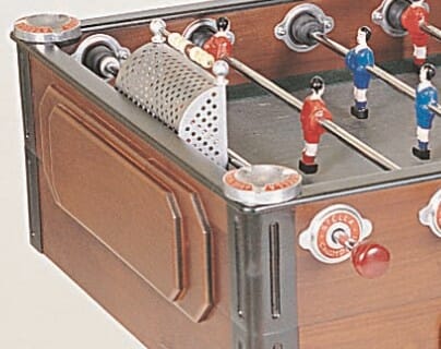 La caisse qui est droite est en bois massif et intègre un monnayeur comme à ses origines. Les pieds sont verticaux avec des sabots pour lui donner un maximum de stabilité. Il pèse 85 kg. Les cages sont perforées à l’ancienne et surmontées d’un compte point de part et d’autre. Aux 4 coins de la table, vous trouverez des cendriers gravés. En fonction de la couleur choisie pour la caisse, les joueurs en aluminium arborent différentes couleurs eux aussi avec pour le modèles rouge rubis des bonhommes en chrome brillant contre des joueurs en nickel mat. Toutes les versions ont des tiges métalliques de renfort ainsi que des barres télescopiques en acier étiré de 15mm de diamètre. Elles sont équipées d’amortisseurs en caoutchouc simple attachés à la caisse. Toutes les barres ont une bague extérieure gravée avec le nom de la marque de baby foot Stella et le nom du modèle Champion. Les bandes latérales comme à l’origine sont inclinées pour permettre les balles sautées (lobs) et les joueurs peuvent jouer la balle avec la tête. La couleur du terrain qui est en Gerflex sera adaptée à la couleur de votre Babyfoot. Les 11 balles en liège livrées avec ce meuble historique descendent dans un présentoir central en bois. Vous pourrez bien sur choisir entre des poignées longues ou des poignées rondes.